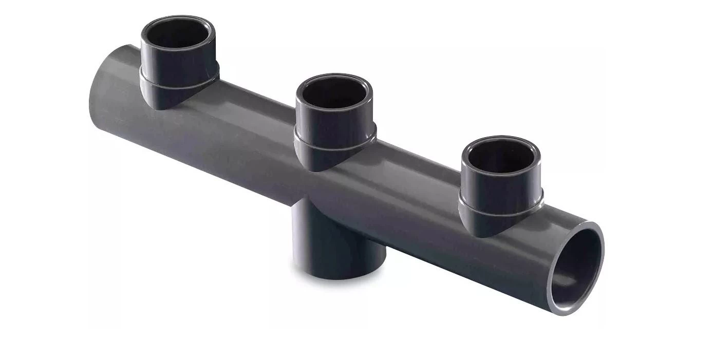 Verdeler/collector PN16 1 ingang 63mm (F) – 3 uitgangen 50mm (F) te lijmen.